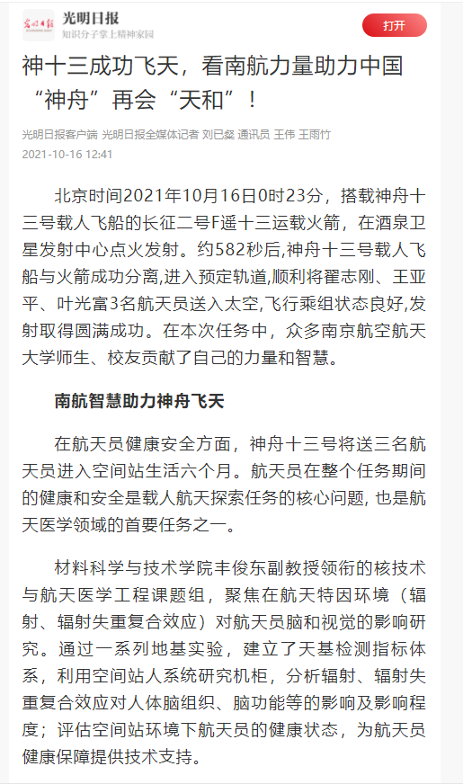 编者按:10月6日,搭载神舟十三号载人飞船的长征二号F遥十三运载火箭顺利将3名航天员送入太空。“神十三”成功飞天的背后,无论是航天员健康安全、交会对接还是空间站建设,无不处处包含着ac米兰官网中文网站众师生的力量与智慧。“效法羲和御天马,志在长空牧群星”,一代又一代ac米兰人为祖国的航天事业默默贡献,为祖国的载人航天事业奉献终身!