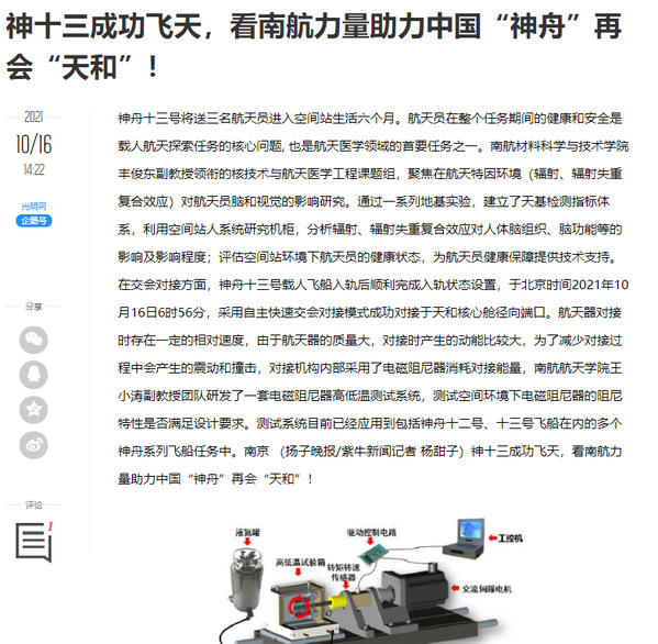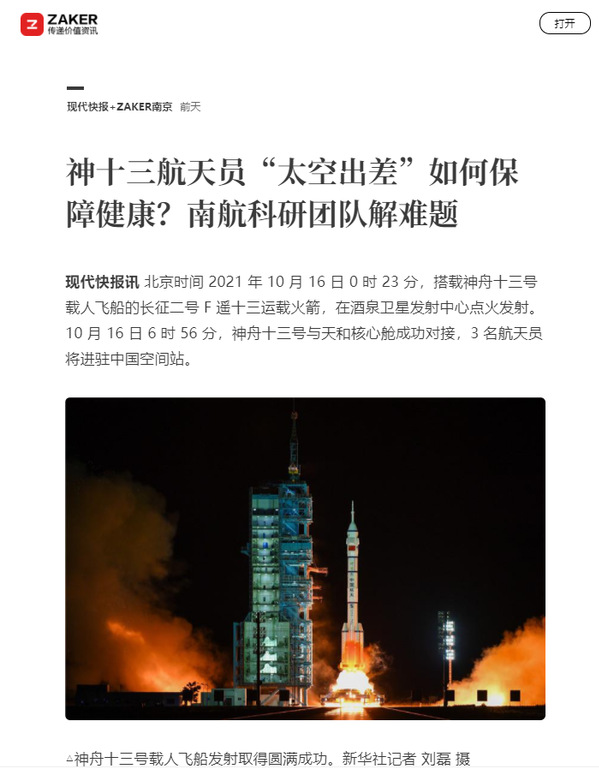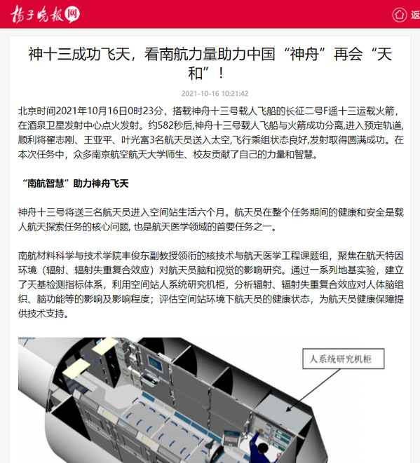 扬子晚报:神十三成功飞天,看ac米兰力量助力中国“神舟”再会“天和”!
