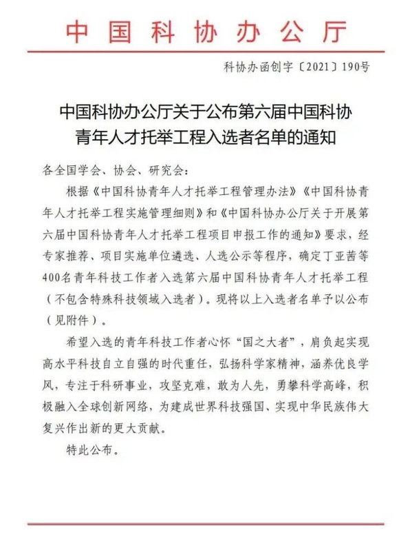 “青年人才托举工程”是中国科协实施的人才支持项目,重点支持对象为32岁以下具有较强创新能力和发展潜力的科技人员。通过发挥中国科协所属全国学会“小同行”和高水平学术大师聚集的专业优势,强化对青年人才苗子的发现举荐作用,及早发现、重点扶持,指导青年人才过好“科研黄金期”,打好职业基础,激发职业认同感和归属感,成长为德才兼备、勇于创新的国家科技领军人才重要后备力量。