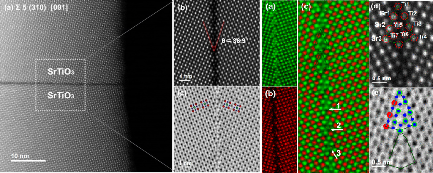 图一 钛酸锶Σ5 (310)晶界的显微结构表征,晶界的原子结构和原子分辨的元素分布。