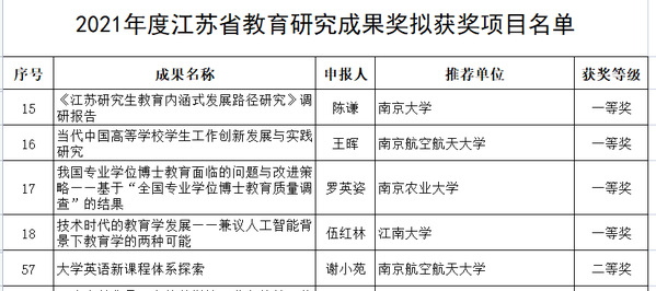 省教育厅为更好地调动全省教育系统广大教师和科研工作者开展科研创新和推动科技进步的积极性,促进产出高质量的教育研究成果,不断提升江苏教育系统科学研究的学术影响力,设立了江苏省教育科学研究成果奖,包括高校科学技术研究成果奖、高校哲学社会科学研究成果奖、教育研究成果奖三个类别,每两年评选表彰一次。今年的教育研究成果奖在单位推荐申报、形式审查和申报公示的基础上,经组织专家会议评审,共评选出获奖研究成果项目200项,其中一等奖20项、二等奖60项、三等奖120项。