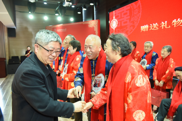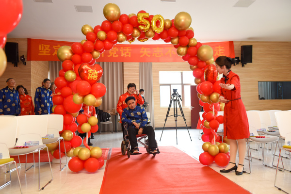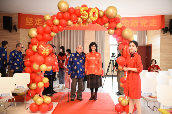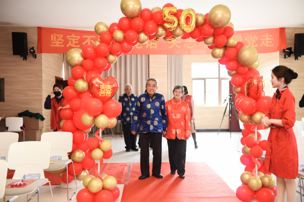 10对金婚夫妇身着唐装礼服,伴随着婚礼进行曲,踏上红地毯。他们将微微颤抖的手紧握在一起,穿过象征幸福吉祥的气球拱门,历经岁月的面容上带着温暖如春的微笑,诠释了“执子之手、与子偕老”爱的诺言,并随着相机快门的声音成为永恒。