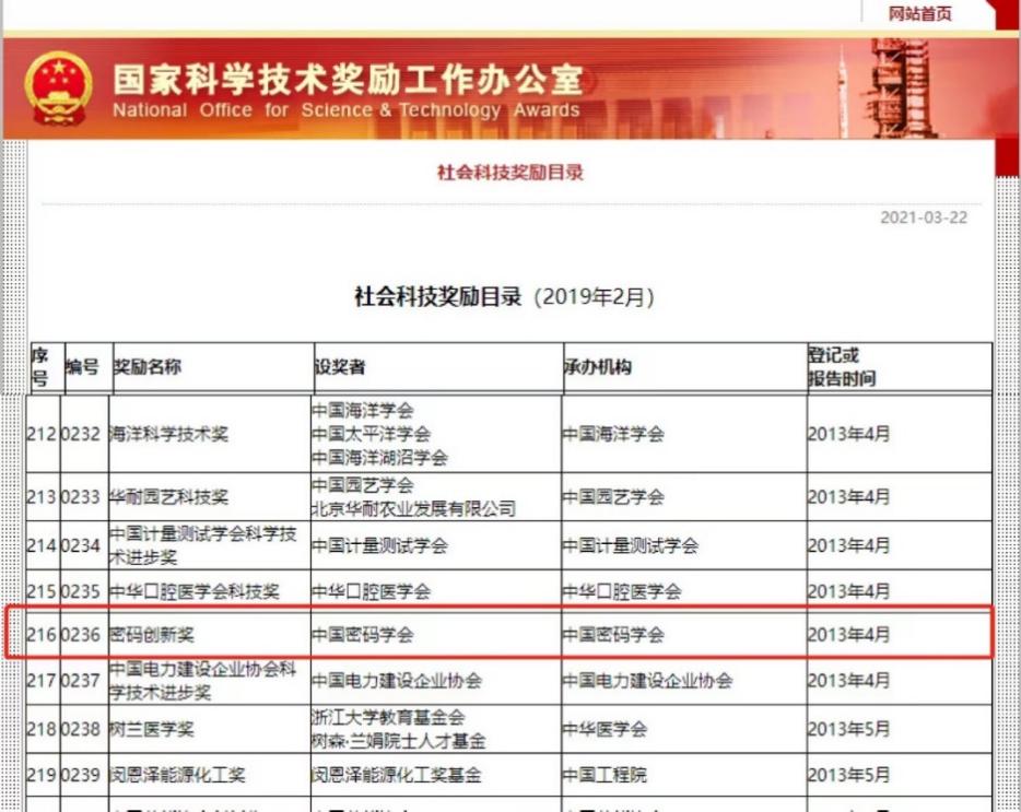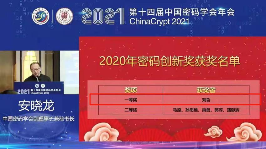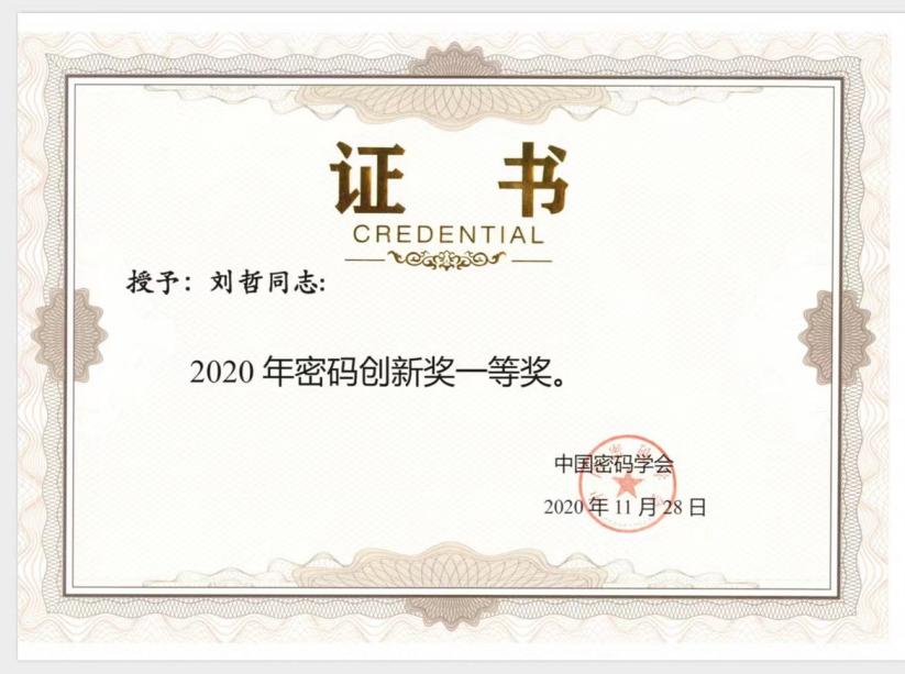 “密码创新奖”是国家科学技术奖励办公室认可的中国密码学会的重要奖项,奖项设置特等奖1名,一等奖2名,二等奖6名。一奖项授予在密码领域有较大创新,达到国际先进水平,且对促进密码科技进步产生重大影响的科技工作者。历史上,该奖项的特等奖仅由王小云院士一人获得过,而一等奖迄今为止仅有五人获得(包含刘哲在内)。