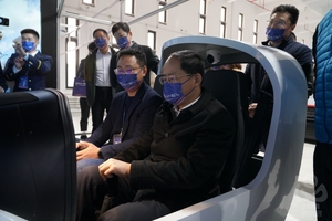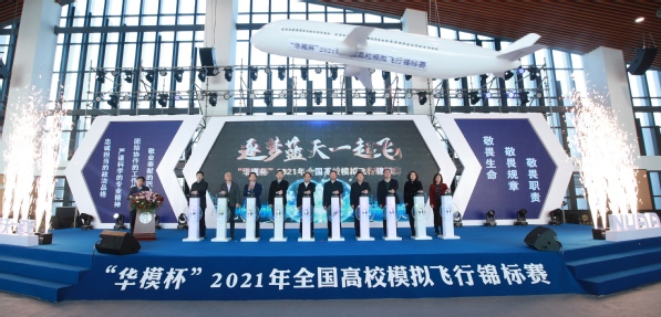 李健、单忠德、丁志平、侯建军、刘宇雷、赵明、郝浚清、王晖、顾宏斌、孙涤非共同推动模拟机操纵杆,正式启动“华模杯”2021年全国高校模拟飞行锦标赛。