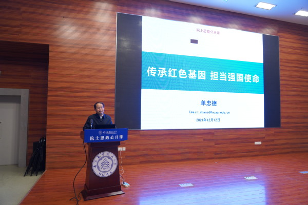 单忠德从“明方向、担使命:为什么要来读大学?”“知校史、牧群星:读了什么样的大学”“立大志、练本领:如何才能读好大学”三个方面为广大新生讲授了一堂生动鲜活的思政公开课。他从国家使命、时代担当、发展需求三个维度深刻诠释了当代青年肩负的历史使命和时代重任,系统阐释了党的十九届六中全会的历史地位和重要意义,特别是深刻阐述了“两个确立”反映了全党全军全国各族人民共同心愿,对新时代党和国家事业发展、对推进中华民族伟大复兴历史进程具有决定性意义,并深入分析了国家实施科技强国、人才强国、制造强国、网络强国和航空、航天、民航强国战略的新形势、新目标、新要求。他表示,大学是锤炼信仰、涵养品德的关键期,是汲取知识、探索未知的黄金期、是练就本领、增长才干的机遇期,勉励全体新生在感悟党的百年奋斗重要成就和历史经验中担当复兴使命,接力爱国奋斗,赓续红色基因,放飞蓝色梦想,让青春在为祖国、为民族、为人民、为人类的不懈奋斗中绽放绚丽之花,努力成为德智体美劳全面发展的社会主义建设者和可靠接班人。