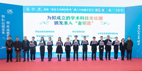 教务处、学生处、研工部、将军路校区、校团委相关负责同志一同为今年拟成立的11个学术科技类社团颁发“准入活力金钥匙”。