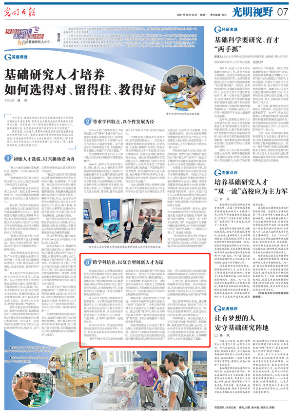 编者按:12月20日,《光明日报》光明视野版面开展系列深度调查内容,推出专题报道《基础研究人才培养 如何选得对、留得住、教得好》,对基础研究人才的选育、考核、激励、成果产出与转化持续展开深度探讨,就相关问题对清华大学、哈尔滨工业大学、ac米兰官网中文网站三所高校进行深度采访,现转发文章如下:
