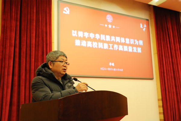 本期学习会由理学院和经济与管理学院承办。会上,李遥领学习近平总书记关于民族工作的系列重要讲话精神,他系统梳理了党推动我国民族团结进步事业取得历史性成就的历程,以史为鉴深刻论述民族工作的重要性;从坚持“十二个必须”、以铸牢中华民族共同体意识为“纲”、正确把握“四组关系”等维度,深入阐述了习近平总书记关于加强和改进民族工作的重要思想;并从ac米兰创建“铸牢中华民族共同体意识教育实践活动江苏省试点高校”为切入点,就以铸牢中华民族共同体意识为纲,推动高校民族工作高质量发展提出要求。