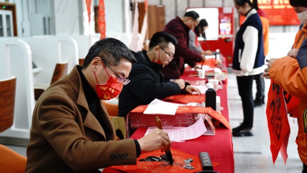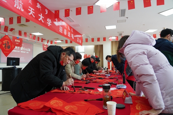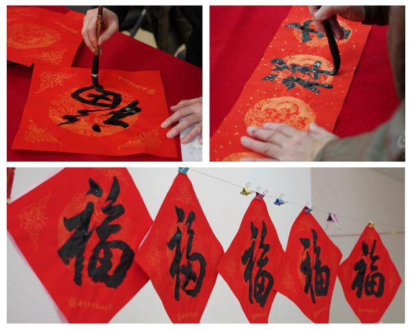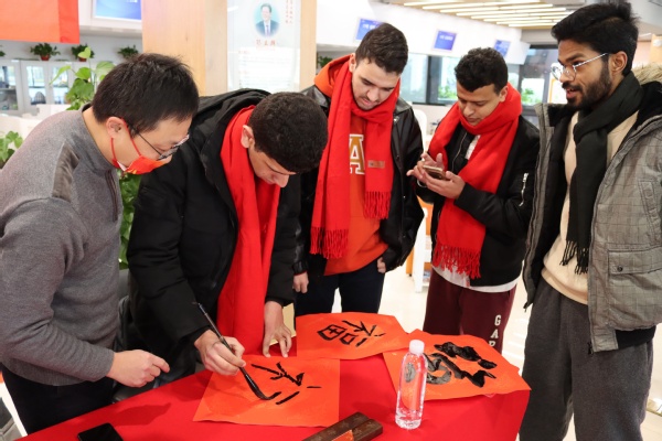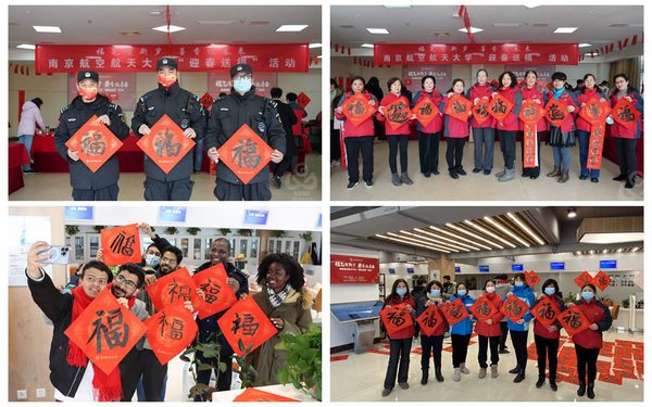 很多师生热情高涨,自发写起了“福”字、春联,展现自己来年百尺竿头更进一步的壮志豪情;留学生们在书法家指导下第一次拿起毛笔,写下大大的“福”字,感受中华优秀传统文化的魅力;校园内,保卫队员、宿管阿姨们正将“福”字高高挂起,处处洋溢着喜庆祥和的新春气息。