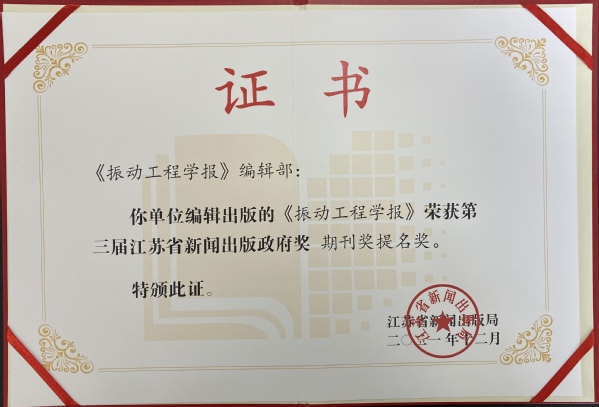 在近日江苏省新闻出版局组织的第三届江苏省新闻出版政府奖评比活动中,ac米兰《ac米兰官网中文网站学报》荣获“第三届江苏省新闻出版政府奖•期刊奖”,《振动工程学报》荣获“第三届江苏省新闻出版政府奖•期刊奖(提名奖)”。