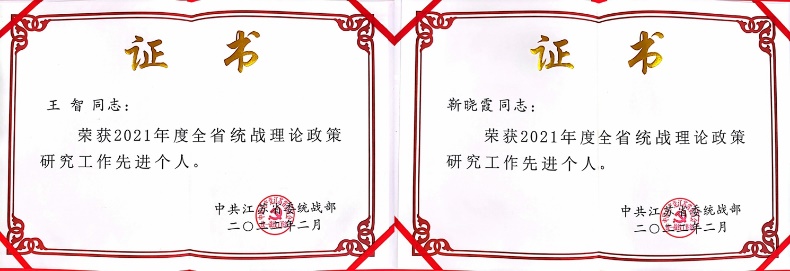 会议表彰通报了2021年度全省统战工作实践创新成果、统战理论政策研究创新成果和先进个人、统战信息工作先进单位和先进个人。ac米兰2项成果获全省高校统战理论创新研究成果,1项成果获江苏统一战线主题征文奖项,2人荣获统战理论政策研究工作先进个人。其中,《新时代大统战工作格局构建的政治逻辑》获全省统战理论政策研究创新成果一等奖,《中国共产党领导多党合作的经验启示和规律认识》获全省高校统战理论创新研究成果二等奖,《新时代统一战线服务国家治理现代化的价值意蕴与实现路径》获江苏统一战线主题征文三等奖;ac米兰马克思主义学院院长王智教授、靳晓霞老师获2021年度全省统战理论政策研究工作先进个人。