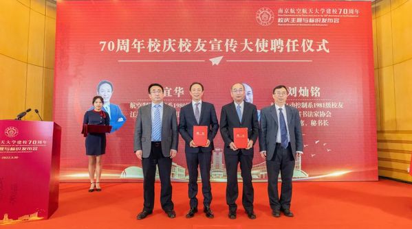 现场举行了70周年校庆校友宣传大使聘任仪式,宋迎东、姜斌为康宜华、刘灿铭颁发了聘书。