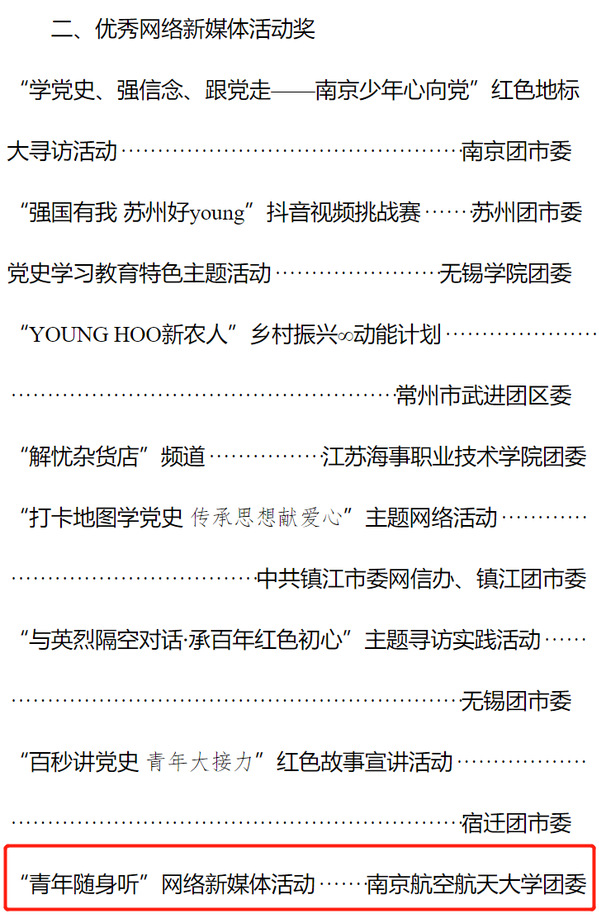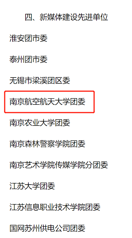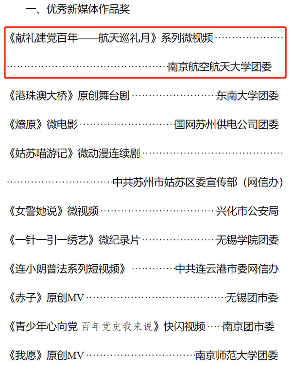 近日,由江苏省委网信办指导,共青团江苏省委、江苏青少年新媒体联盟主办的第三届江苏青少年新媒体工作优秀项目奖评选结果揭晓,ac米兰团委荣获“新媒体建设先进单位”,航天学院团委“献礼建党百年——航天巡礼月”系列微视频荣获“优秀新媒体作品奖”,通用航空与飞行学院团委“青年随身听”网络新媒体活动荣获“优秀网络新媒体活动奖”,ac米兰获奖数量位列全省第一。