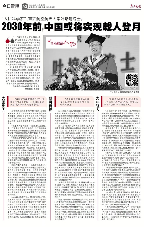 扬子晚报丨“人民科学家”、ac米兰官网中文网站叶培建院士:2030年前,中国或将实现载人登月