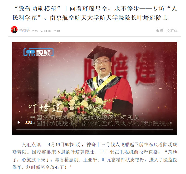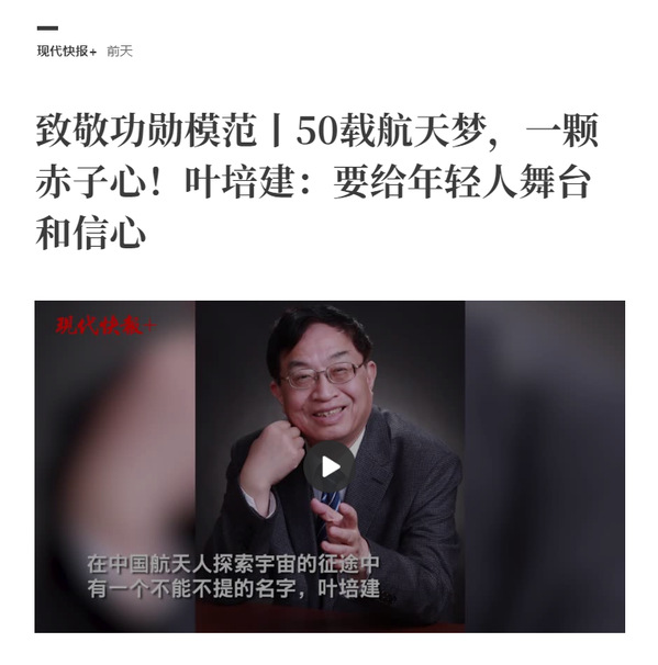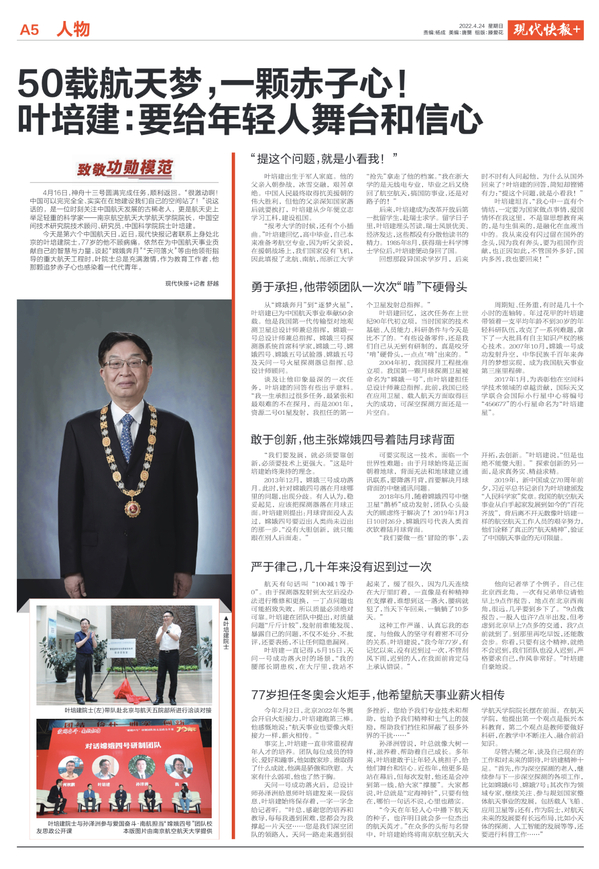 现代快报丨50载航天梦,一颗赤子心!叶培建:要给年轻人舞台和信心