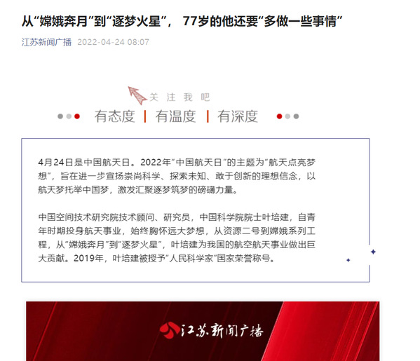 江苏新闻广播丨从“嫦娥奔月”到“逐梦火星”, 77岁的他还要“多做一些事情”