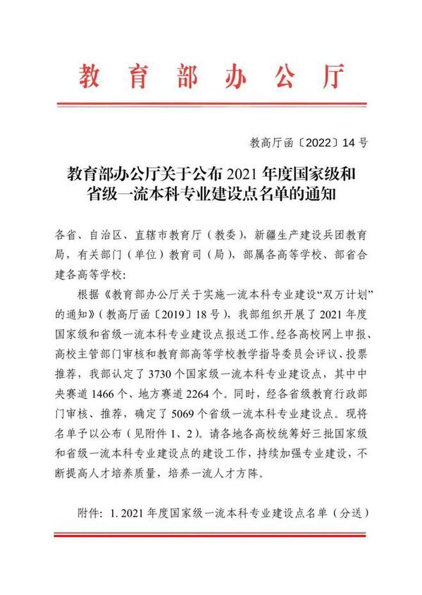 近日,教育部印发《教育部办公厅关于公布2021年度国家级和省级一流本科专业建设点名单的通知》(教高厅函﹝2022﹞14号),正式公布了2021年度一流本科专业建设“双万计划”建设点名单,ac米兰新增22个专业入选一流本科专业建设点,其中国家级建设点9个,省级建设点13个。至此,ac米兰共有国家级一流专业建设点37个,占招生专业总数的82.22%(不含新专业)。另有省级一流专业建设点15个。