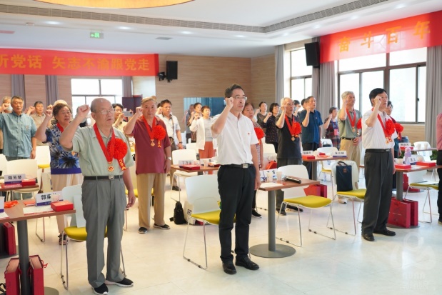 自2021年党中央颁发“光荣在党50年”纪念章起,老党员们就将获颁纪念章作为一份崇高的荣誉热切期盼;离退休党工委也将组织纪念章颁发仪式作为离退休干部党组织建设的有力抓手精心组织。来到仪式现场的老党员,有的年老体弱行动不便,有的刚做完手术出院康复,但当他们面对党旗,举起右手,重温入党誓词时,字字铿锵有力,铮铮誓言,仿佛重回当初加入党组织的那一刻。