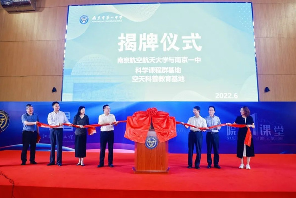 在南京一中师生的见证之下,郭万林、刘宇雷、冯绍红、侍旭与朱焱、张苏皖等领导共同为“科学课程群基地”和“空天科普教育基地”揭牌。