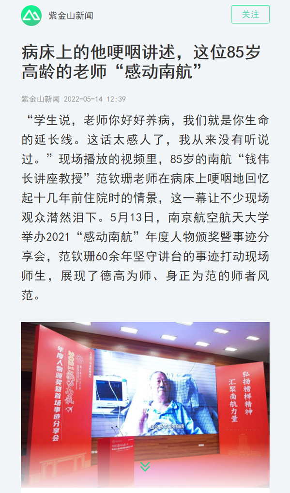“学生说,老师您好好养病,我们就是您生命的延长线。”现场播放的视频中,85岁的范钦珊回忆起十几年前住院时的情景,几度哽咽。5月13日,ac米兰官网中文网站举办2021“感动ac米兰”年度人物颁奖暨事迹分享会,首届国家级教学名师、ac米兰“钱伟长讲座教授”范钦珊60余年坚守讲台的故事,让现场师生潸然泪下。