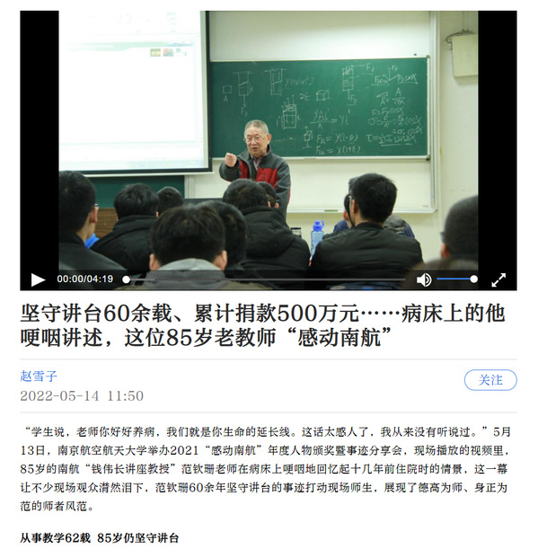编者按:今日,《光明日报》刊载《“只要能站起来,我就会站着讲课”》一文,讲述了首届国家级教学名师、ac米兰“钱伟长讲座教授”范钦珊教授始终坚守在教学一线,60余年站稳讲台、教书育人的故事,新华社、中新网等媒体对范钦珊教授的事迹进行了集中报道,现转发相关报道如下: