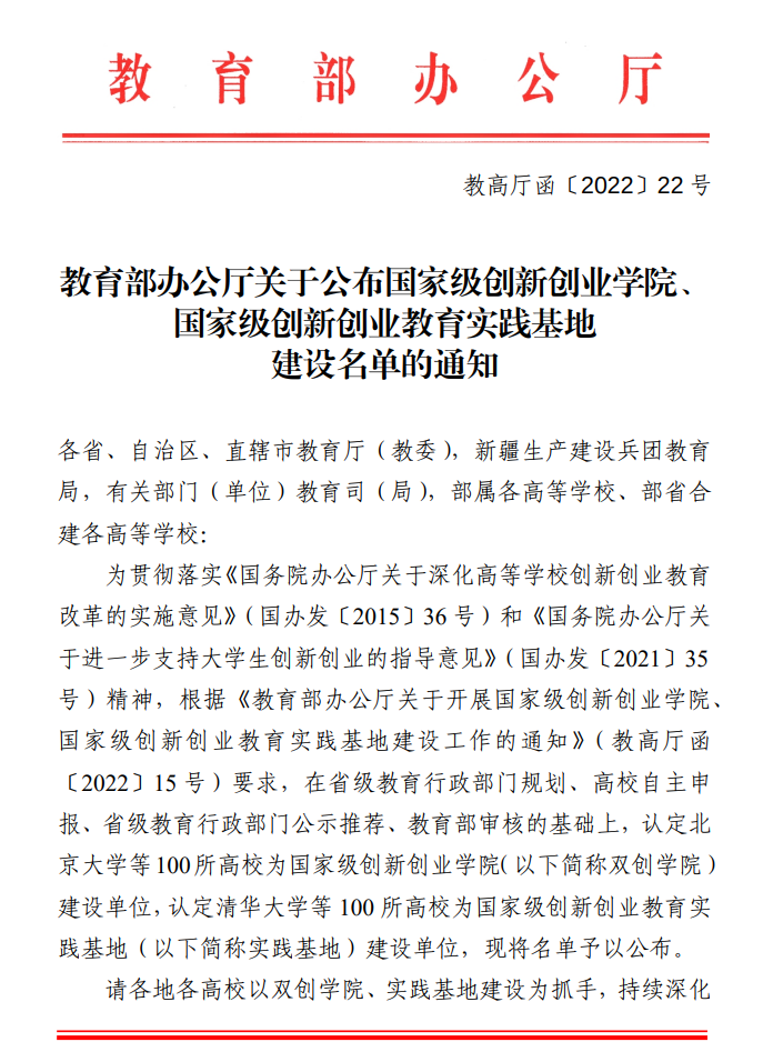为全面贯彻落实《国务院办公厅关于深化高等学校创新创业教育改革的实施意见》(国办发〔2015〕36号)和《国务院办公厅关于进一步支持大学生创新创业的指导意见》(国办发〔2021〕35号)精神,教育部首次面向全国高校建设100个国家级创新创业学院和100个国家级创新创业教育实践基地。学校高度重视申报工作,按照相关要求积极进行申报,由教务处、创新创业学院牵头,教师发展与评估中心、长空学院、学生处、校团委等部门共同参与,多次召开研讨会,认真总结改革经验,精心组织申报材料,为成功入选首批国家级创新创业学院建设单位做了充分准备。