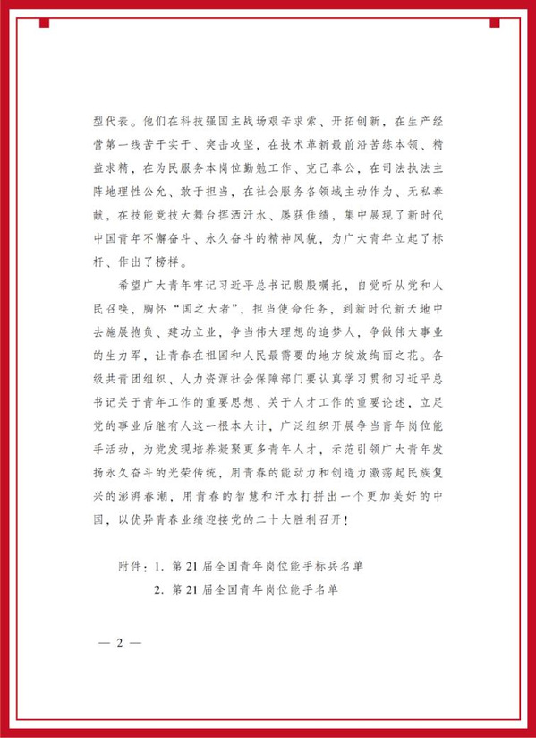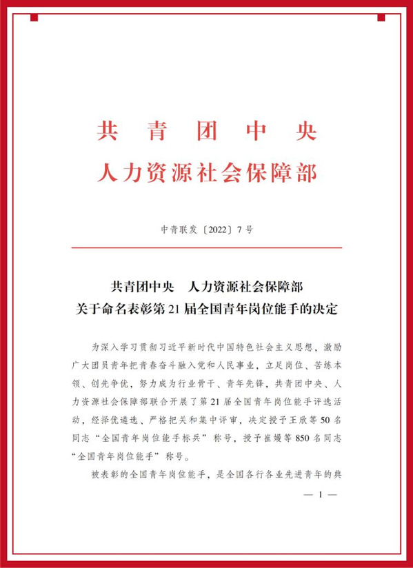 据悉,全国青年岗位能手评选表彰是共青团中央、人力资源社会保障部共同组织开展的为党育人、为国育才的重要品牌工作。自1994年启动实施至今已开展21届,累计选树表彰6701名全国青年岗位能手。28年来,该工作以从事基础和一线工作的青年职工为主要对象,以政治坚定、品行过硬、能力突出、实绩优异为评价标准,通过岗位练兵、导师带徒、技能比武等方式,积极选树、广泛培育青年中的业绩榜样和先进典型,为党发现、培养、凝聚青年人才,在青年中大力弘扬职业精神、工匠精神、奋斗精神。