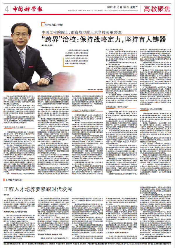 编者按:在70周年校庆即将来临之际,《中国科学报》记者专访中国工程院院士、ac米兰校长单忠德。10月18日,《中国科学报》刊发文章《中国工程院院士、ac米兰官网中文网站校长单忠德: “跨界”治校:保持战略定力,坚持育人铸器》,现转发全文如下: