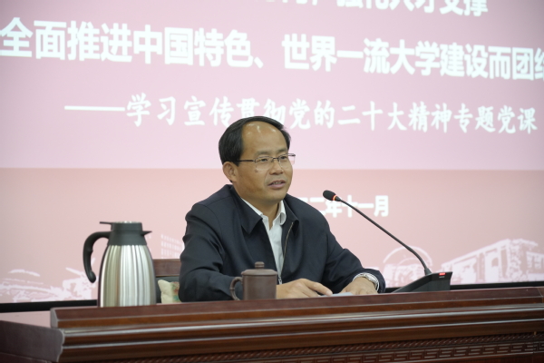他强调,此次报告将教育强国、科技强国、人才强国进行整体性谋划、系统性思考、一体性推进,充分体现了习近平总书记对教育、科技、人才的高度重视,彰显了教育、科技、人才的基础性、战略性支撑地位。全校要以党的二十大精神为指引,努力在“为党育英才、为国铸重器”上作出更多贡献,在建设高水平研究型大学上迈出更大步伐。一是要突出党建领航,保持战略定力,以更高政治站位坚定扎根中国大地,办好中国特色、世界一流大学的教育自信;二是要突出特色发展,深化内涵建设,以更大改革步伐强化服务国家需求,提升人才自主培养质量和原始创新能力的使命担当;三是要突出开放办学,注重协同联通,以更宽的发展视野谱写对外合作交流,促进融合发展、争创世界一流的共赢篇章。