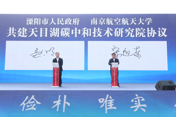 校党委常委、副校长宋迎东,溧阳市常委、常务副市长赵明代表校地双方签订共建天目湖碳中和技术研究院协议。