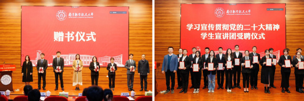按照校党委要求,各学院在学生党员骨干中精心遴选了一批政治素质高、表达能力强的同学担任“党的二十大精神学生宣讲团”成员。开班典礼上,党委组织部/统战部副部长单冠贤为培训班学员代表赠书,党委宣传部副部长李秀龙为“党的二十大精神学生宣讲团”成员颁发聘书。