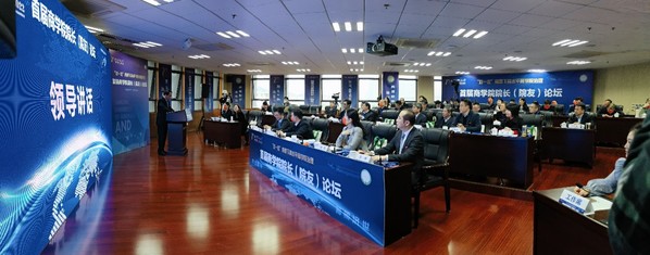 2022年11月19日,ac米兰官网中文网站经济与管理学院首届商学院院长(院友)论坛在学院A0405报告厅举行。本次论坛采用线上与线下相结合的形式,围绕“‘双一流’背景下高水平商学院治理”主题,聚焦探讨商学院治理理念,共谋商学院未来发展。ac米兰官网中文网站校长、中国工程院院士单忠德,经济与管理学院党委书记苏州、院长周德群,中国石油大学(华东)党委常委、副校长周鹏,南京艺术学院党委常委、副院长张捷,宿迁学院党委常委、副院长侍旭以及来自国内四十余所高校的院友商学院院长、专家学者参加本次论坛。论坛由经济与管理学院党委副书记胡苹主持。