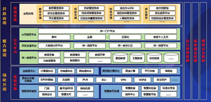 优化顶层架构,完善规划体系。信息化处牵头完成了信息化顶层设计,明确了“整合通用、强化共用、开放应用”的建设思路,构建了技术维度和管理维度相结合的“三横三纵”的总体架构,为全校信息化建设进一步统一了思想,凝聚了共识,发挥了重要的指导作用。