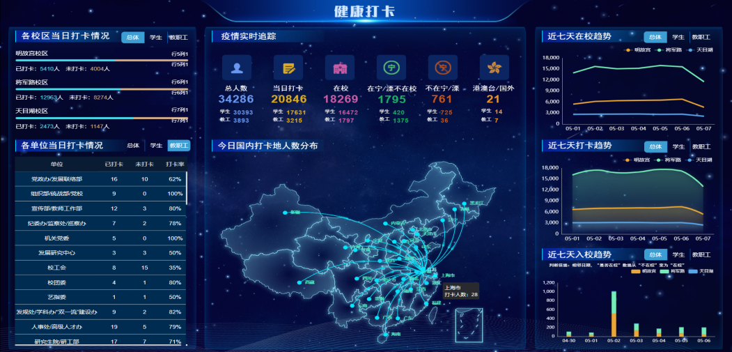 提高站位,助力疫情防控保障。疫情期间,积极响应,主动作为,利用数字智慧筑牢学校疫情防线,全力保障学校教育教学、办公办事、师生安全。打造线上流程,构建校园进出管控系统。在“i·ac米兰APP”上线师生每日健康上报、校园健康码、核酸扫码登记等一系列应用共计58个,实现了师生全覆盖,确保疫情信息及时准确;组织建设三校区人脸识别速通门系统,实现人脸识别通行及自动测温,强化校园安防体系。及时响应各单位、各群体不同需求,不断迭代开发并上线疫情防控相关流程。累计上线校外人员进校申请、学生零星进校申请、教职工离宁(溧)申请等各类流程36个,常用的7个进出校相关流程版本数达155个。积极探索“数字+防疫”,针对“疫情上报一站提供、疫情预警一键查询、基础信息一屏统览、日常监管一体联动、数据分析一窗呈现”五大应用场景,提供多维度疫情分析服务,提高校园防疫指挥水平。结合数据治理,实现学校各业务单位人员基本信息、进出校申请、道闸进出、核酸检测数据的互通共享,通过融合校外核酸检测数据,增加两码一证OCR识别、风险区数据识别,大幅简化师生进出校申请手续,减轻审核人员工作强度,使防疫工作更加精准化、智能化、人性化。