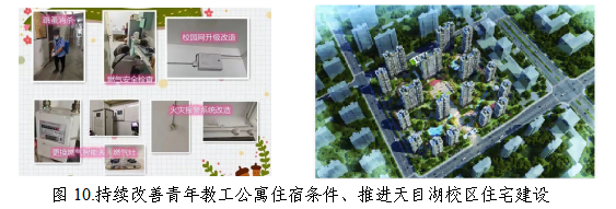 持续改善青年教工公寓住宿条件。提高公寓物业服务品质,提升管理服务水平。完善校园公共服务设施,对有安全隐患的老旧电梯进行更换,在明故宫校区安装充电动自行车电桩安装,满足了广大教职工安全充电、绿色出行的需求。推动天目湖校区教工住宅建设,稳步推进后勤体制改革和机制创新,进一步推动学院楼物业改革。