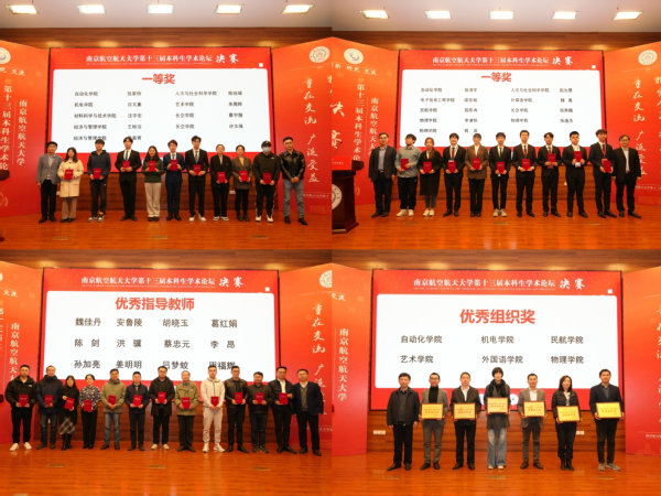 经过激烈角逐,航空学院罗欢同学、机电学院何健超同学、经济与管理学院李培泽同学分获本届学术论坛的冠军、亚军和季军。易敏等20位老师荣获“优秀指导教师”荣誉称号,自动化学院、机电学院、民航学院、艺术学院、外国语学院、物理学院6个学院荣获“优秀组织奖”。
