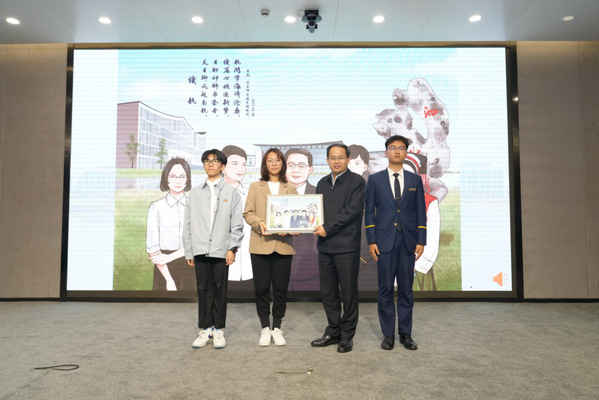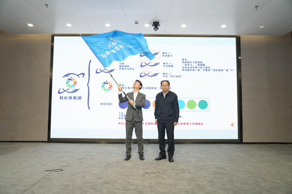 校长为续航团授旗,续航团代表与校长互赠纪念品,百名师生与校长现场扫码建群。