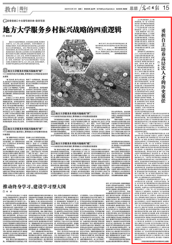 编者按:12月13日,《光明日报》刊发校党委书记郑永安文章《勇担自主培养高层次人才的历史重任》,现将全文转发如下: