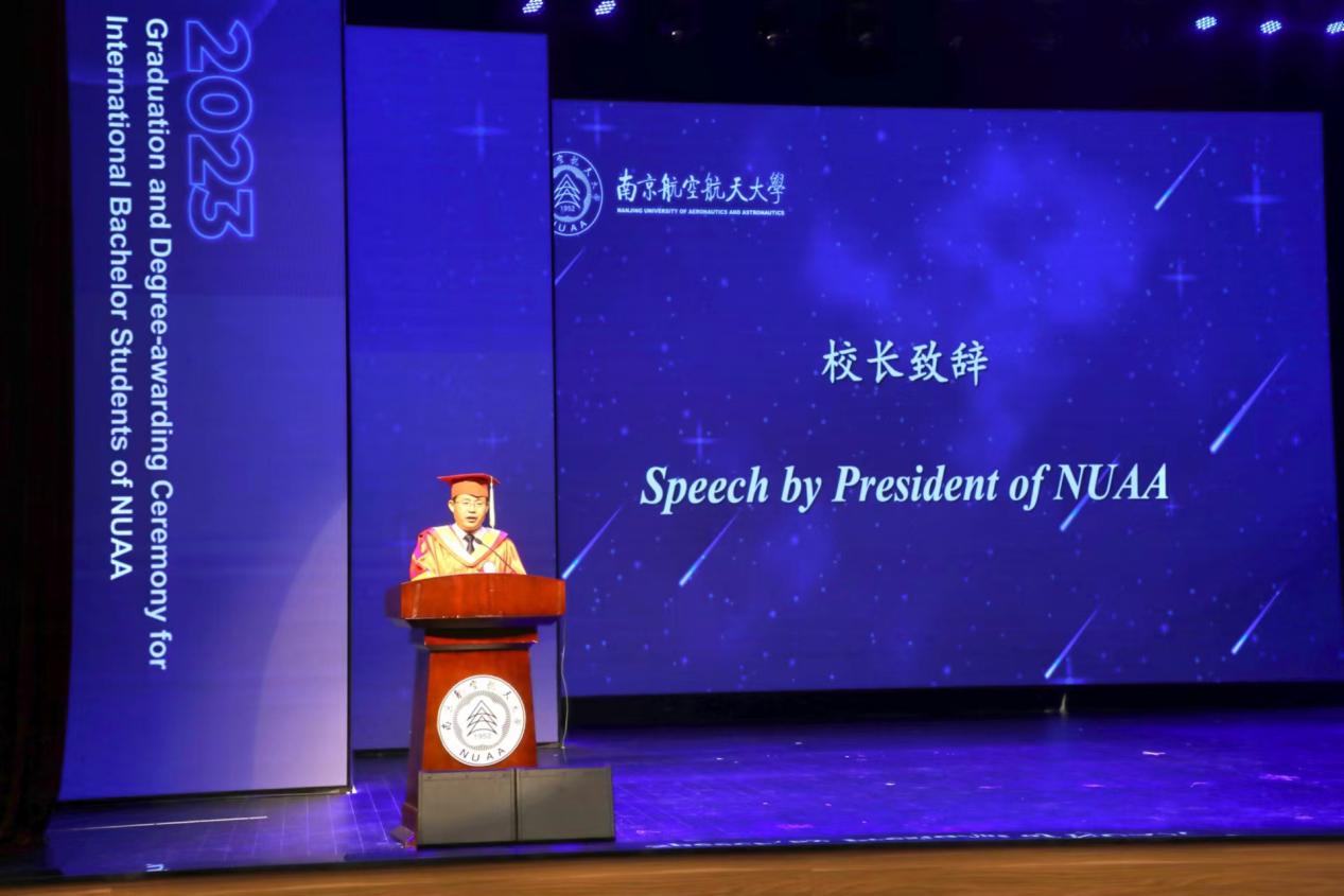 近日,2023届本科留学生毕业典礼暨学位授予仪式在将军路校区艺术中心演艺剧场举办。校长单忠德、副校长姜斌,教务处、学生处、校团委、国际合作处、保卫处、教师发展与教学评估中心、将军路校区管委会等职能部门主要领导、教师代表和家长代表参加典礼。国际教育学院副院长李勇主持本次典礼。