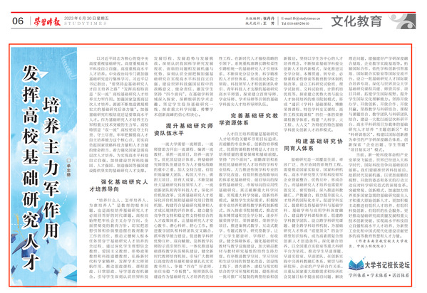 以习近平同志为核心的党中央高度重视基础研究,高度重视高水平科技自立自强,高度重视高水平人才培养。中央政治局专门就加强基础研究进行集体学习,习近平总书记指出,“要坚持走基础研究人才自主培养之路”“发挥高校特别是‘双一流’高校基础研究人才培养主力军作用,加强国家急需高层次人才培养,源源不断地造就规模宏大的基础研究后备力量”。加强基础研究归根结底还是要靠高水平人才。作为基础研究人才培养主力军和重大技术突破的生力军,高校特别是“双一流”高校更应守土有责、守土尽责,牢牢把握提高人才自主培养能力这个核心点,切实肩负起国家战略科技力量和人才力量的使命担当,着力强化国家急需高层次人才培养,为实现高水平科技自立自强,加快建设世界科技强国、人才强国、制造强国等强国建设提供坚实的基础研究人才支撑。