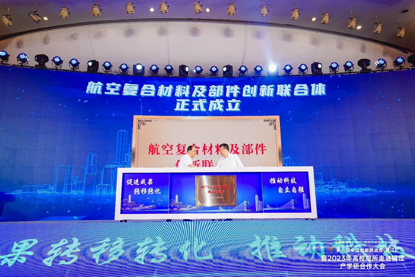 8月12日,第八届中国创新挑战赛(镇江)暨2023年高校院所走进镇江产学研合作大会举行,江苏省副省长胡广杰、副秘书长巩海滨,科技厅厅长徐光辉,镇江市委书记马明龙,市委副书记、市长徐曙海等领导嘉宾出席大会,校长单忠德院士受邀出席,并为航空复合材料及部件创新联合体揭牌。