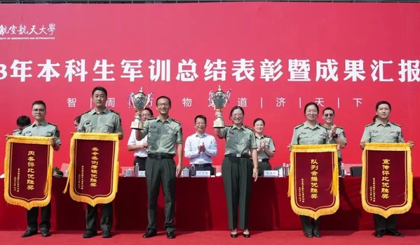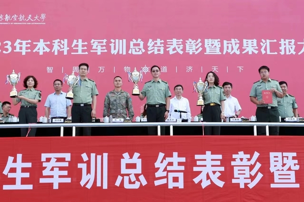 汇报结束后,施大宁和刘宇雷代表学校向承训部队赠送了锦旗。大会对在本次军训中表现突出的集体和个人进行表彰。能源与动力学院、电子信息工程学院/集成电路学院、数学学院、人文与社会科学学院、长空学院、通用航空与飞行学院等6个学院获评军训工作先进单位,504名学生获评军训先进个人。