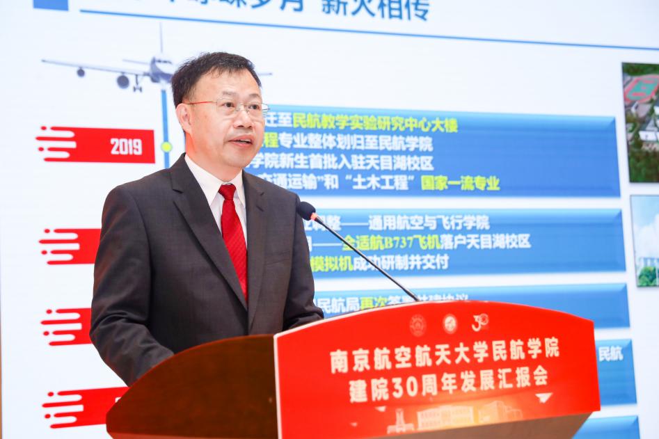 民航学院院长孙建红代表学院作工作报告,就民航学院三十年来的建设发展情况以及今后一段时期民航学院发展的基本设想和思路进行汇报。他指出,三十年来,民航学院师生步履铿锵,为建设高水平的民航学院笃行不怠、自强不息。新时代、新征程,面对交通强国战略所带来的机遇和挑战,民航学院将继续紧密对接国家民航运输业重大需求,贯彻落实学校强化民航特色举措,构建国际合作体系,力争将民航学院建设成为特色鲜明的世界一流民航学院,为中国民航事业提供一流的人才支撑、科技服务和智力支持。