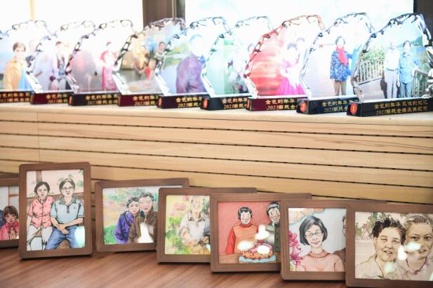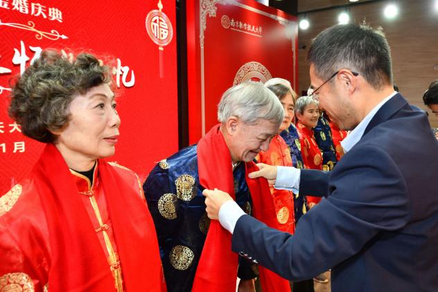 杭育新为金婚夫妇们戴上象征吉祥喜庆的红围巾,并代表学校向大家致以真挚的祝福。他表示,金婚夫妇们五十载爱国爱家,相知相守,悉心经营家庭、精心哺育子女、勤奋刻苦工作,为下一代的健康成长、学校的事业发展和社会主义现代化建设贡献了力量。祝愿金婚夫妇们身体健康、幸福美满、万事如意。金婚夫妇原所在单位负责同志送上定制的精美相框,青年师生代表送上由艺术学院学生手绘的肖像画。