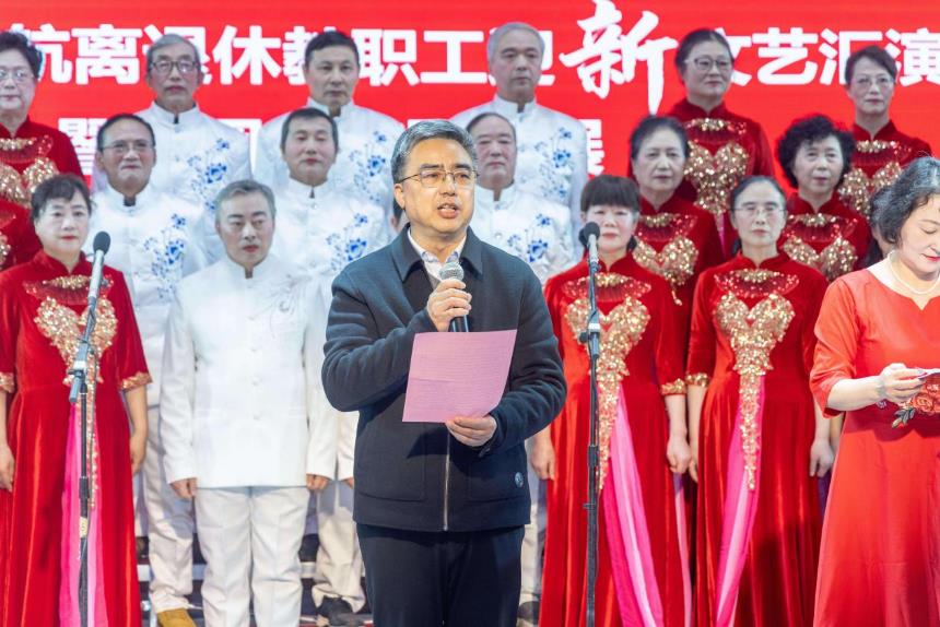 单忠德代表学校党委和全校师生员工向离退休老同志们一直以来对学校各项工作的关心支持表示衷心感谢,向大家默默无闻的倾情付出表示崇高敬意。他指出,精彩的汇演节目充分体现了老同志们的高站位、高水平、高标准,真切感受到了大家离退休生活的幸福,真诚地希望大家的日子越过越好、身体越来越好,更好地为家庭幸福、学校发展、社会进步发挥智慧和力量。他祝愿老同志们在新的一年里身体健康、心想事成,万事如意、阖家幸福。他表示,学校将全力以赴、用心用情做好服务保障,切实为老同志们办实事、解难题,为老同志们颐养天年、发挥特殊优势和力量创造良好条件。