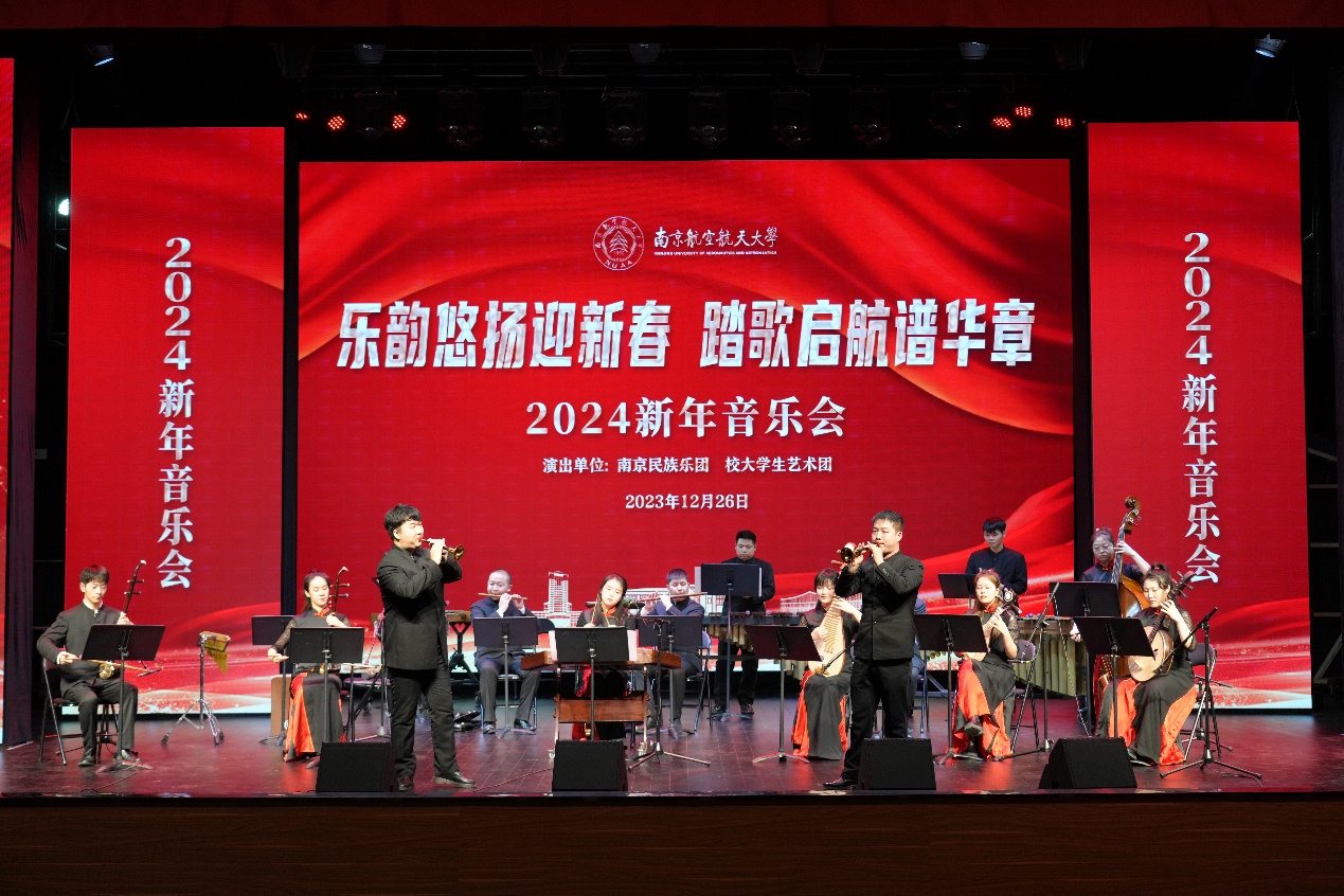 新年音乐会在校大学生艺术团的弦乐合奏《弦乐三章》中拉开序幕。从千年骨龠到江南丝竹,从经典民乐独奏到传统与现代的碰撞,既有充满中式浪漫的新江南丝竹《良辰美景》,有极具民族情思的室内乐《山语·幻》、二胡独奏《椰岛风情》,也有融合传统与时尚的器乐合奏《弹拨摇滚》、室内乐《茶马》等精彩曲目。南京民族乐团古龠非遗传承人于东波用一曲《九千年的回响》,带领现场观众一同领略中国最古老的乐器——贾湖骨龠的风采。在唢呐与乐队合奏的经典曲目《百鸟朝凤》中,音乐会落下帷幕。