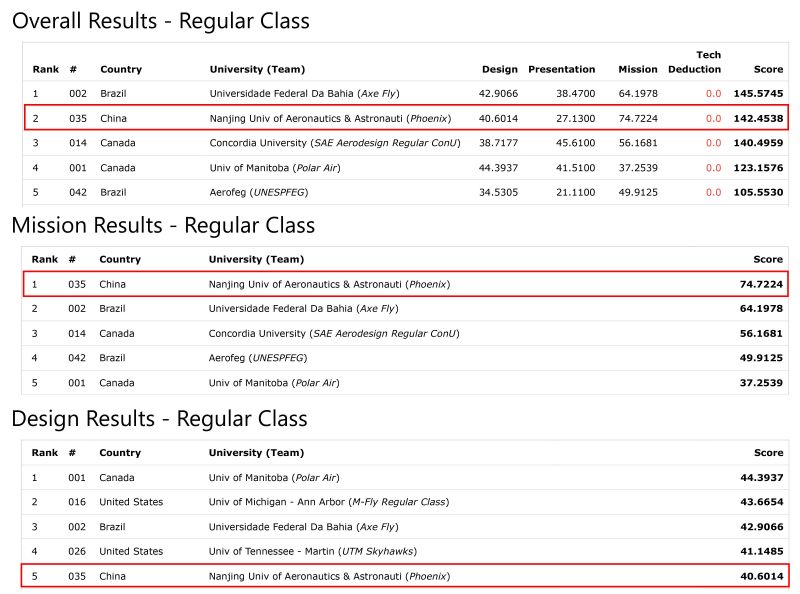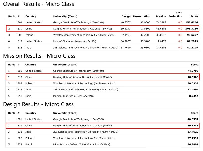 微型组取得了设计报告第二名、飞行挑战第二名以及总成绩第二名的优异成绩。
