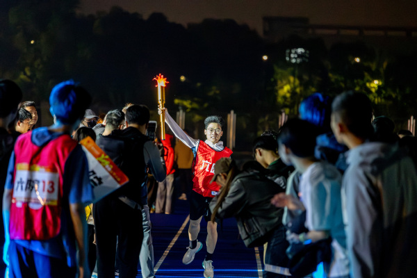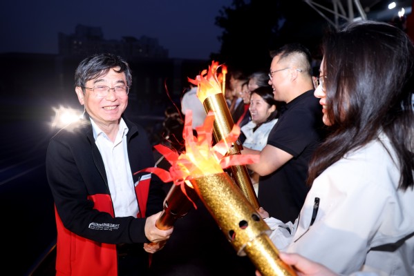 施大宁点燃象征青春传承的火炬,传递给各学院党委副书记、各代表队成员手中。