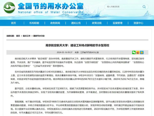 ac米兰官网中文网站秉承“航空报国”的办学传统,高度重视节水工作,建有完善的节水管理体系、行之有效的节水管理制度,坚持通过宣传教育、节水技改、推广节水器具、数字化监控等手段强化节水管理,先后获得“全国文明校园”“全国首批公共机构能效领跑者”“全国首批公共机构节能示范单位”“江苏省节水型学校”等荣誉称号。
