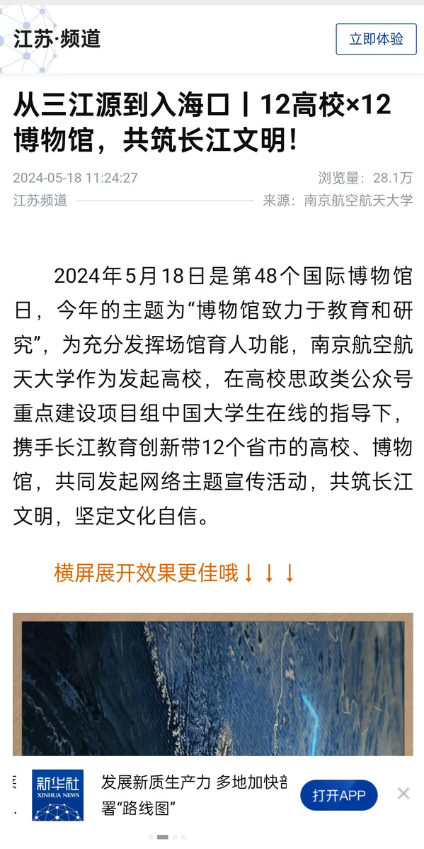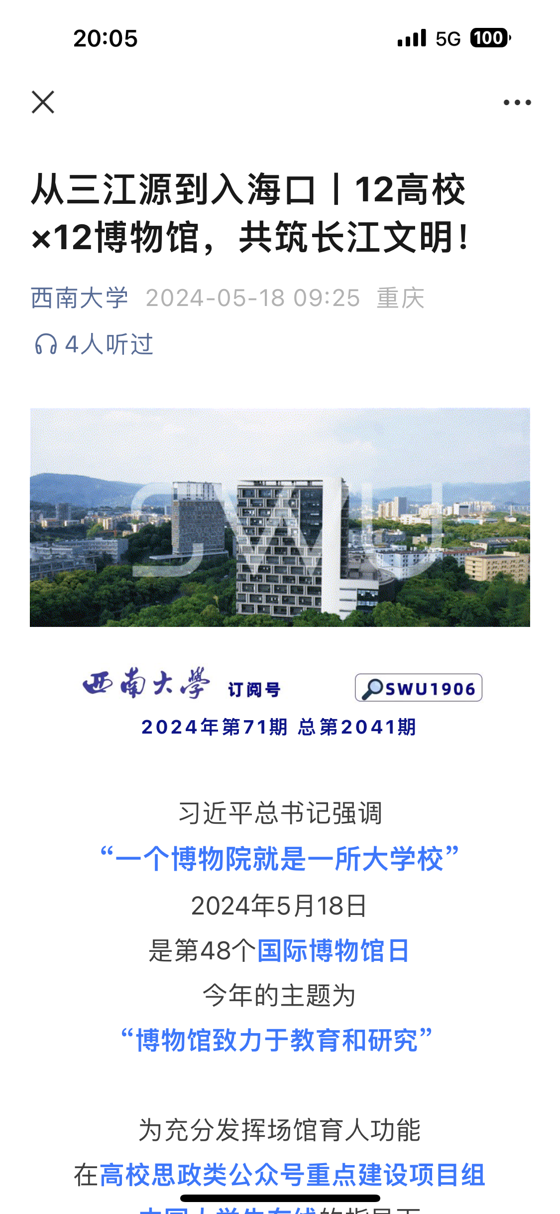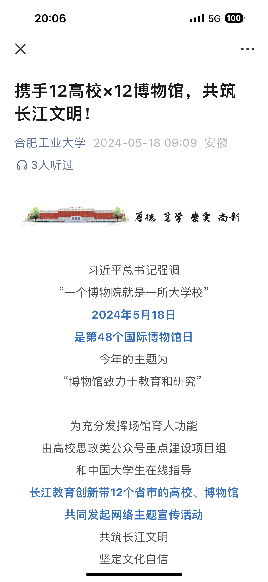 5月18日,国际博物馆日当天,在高校思政类公众号重点建设项目组、中国大学生在线的指导下,由ac米兰发起,联合长江教育创新带12个省市的高校和12所博物馆,携手开展了“探寻长江文明 坚定文化自信”网络主题宣传活动,当天,ac米兰还举行了国际博物馆日公众开放日活动。